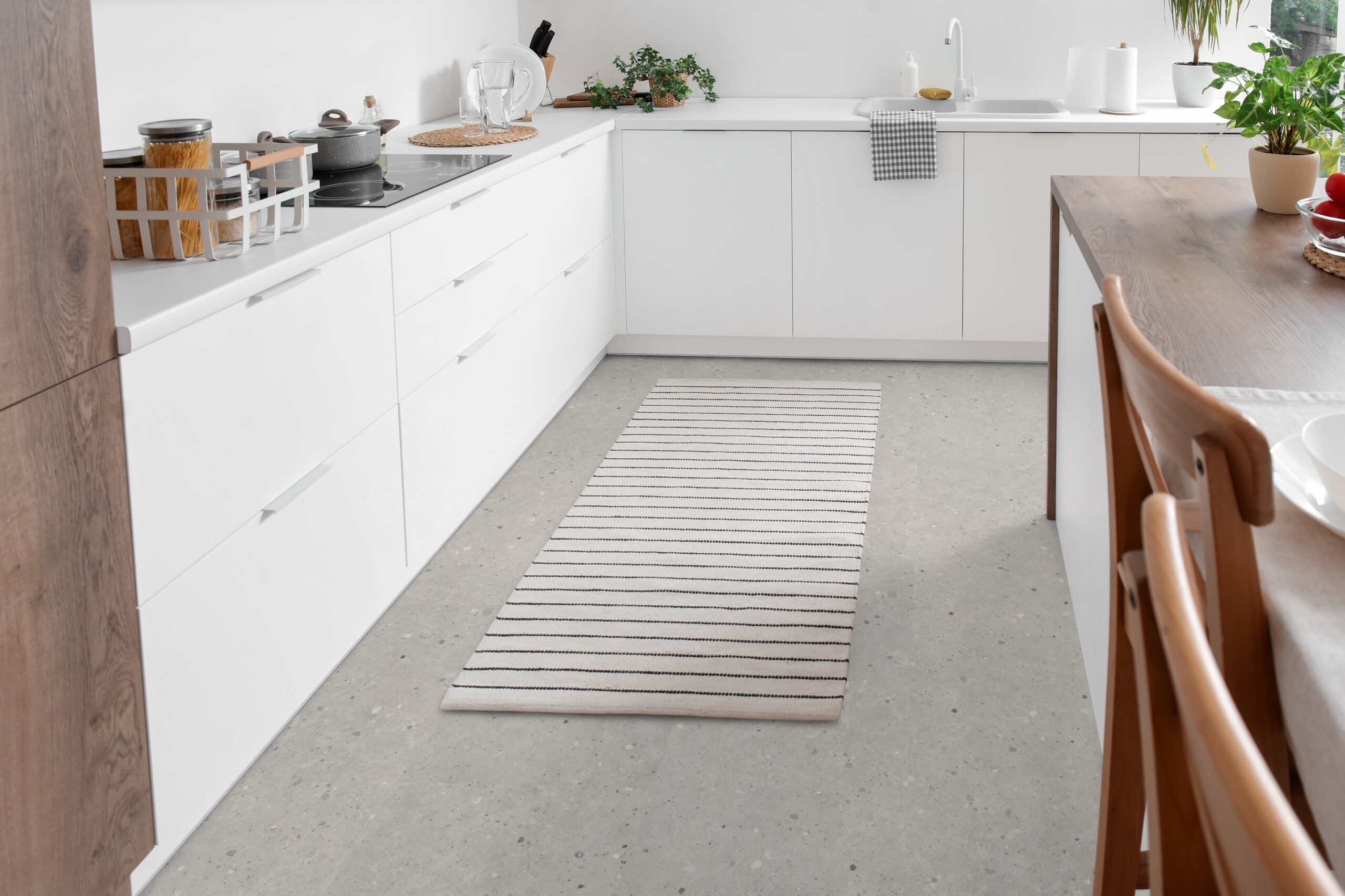Bringen Sie mit Vinyl-Fliesen Stil in Ihr Zuhause. Unser Naturstein-Design Cement Terrazzo Beige ist der perfekte Bodenbelag für Ihre Küche oder Ihr Bad. Unser Bodenbelag ist langlebig, geeignet für Feuchträume und mit Fußbodenheizung kompatibel – und somit sowohl praktisch als auch stilvoll. Mit unseren Vinyl-Fliesen, die eine optimale Raumluftqualität aufweisen und zu 100 % phathalatfrei sind, steht das Wohlbefinden Ihres Haushalts an erster Stelle.