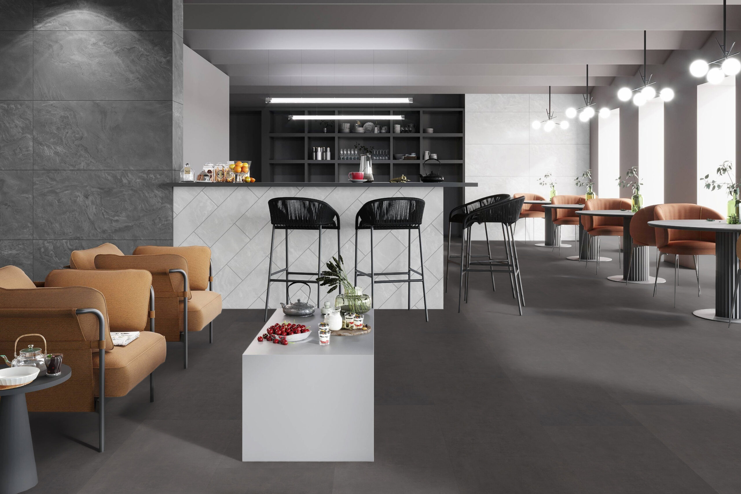 The modern design of our Concrete Terreno Dark Grey tiles enhances the aesthetic of any room. Perfect for spaces ranging from offices to retail stores, hotels, and restaurants, our resistant looselay vinyl tiles are built for durability. Their installation system allows for quick setups while ensuring easy and practical maintenance. For enhanced stability, a tacky adhesive can be used: this solution keeps the tiles securely in place while allowing for easy removal without leaving any residue or damaging the subfloor.